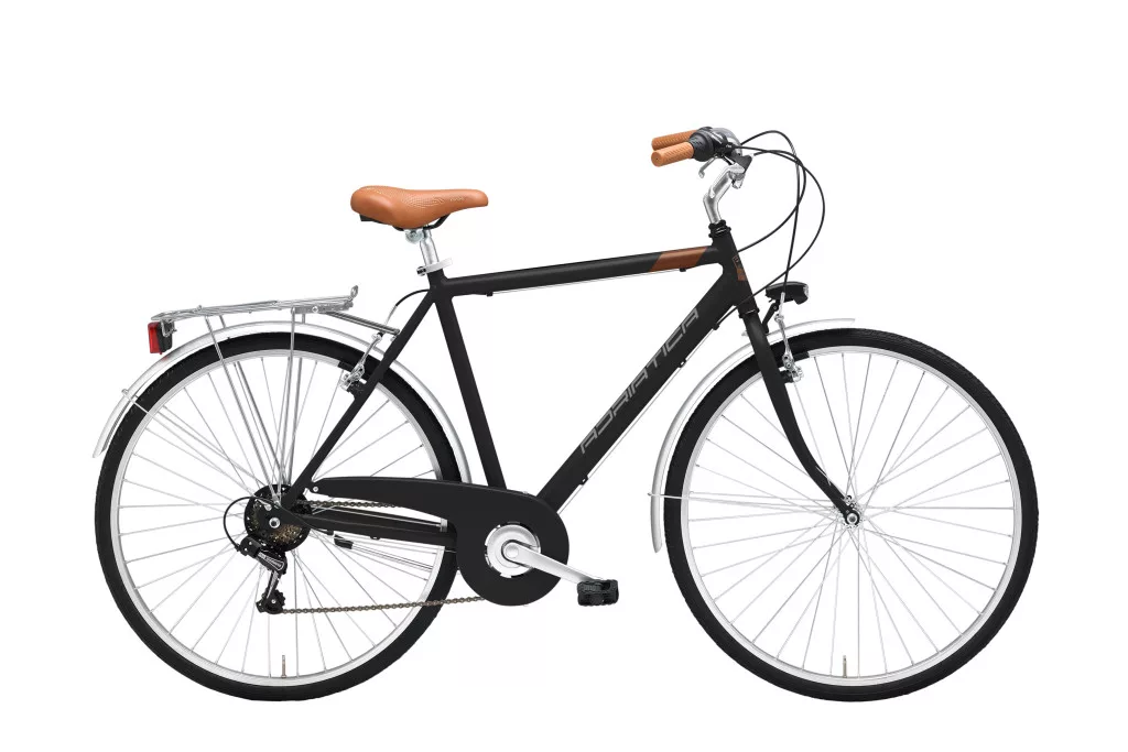 Klasszikus olasz 28" alu trekking kerékpár fekete, férfi H50-es keretben – Shimano 6s fogaskerékcsoport, V-fék, TRK alu felni, 700×35C gumi. Megbízható, könnyű városi és trekking kerékpár, 1946 óta tartó olasz örökséggel.